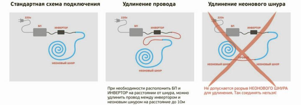 يتم توصيل النيون البارد من خلال عاكس بمصدر طاقة 12 أو 24 فولت ، اعتمادًا على طول السلك المضيء.