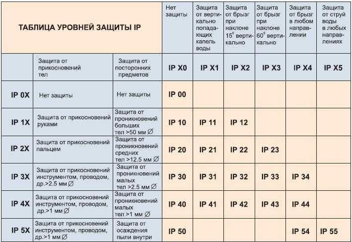 درجة حماية الشريط من التأثيرات الضارة. يحتوي المنتج دائمًا على علامة IP ، والتي تخبرك بما يتم حماية المنتج منه. من أجل التبسيط ، يتم تقديم جميع المعلومات الضرورية في الجدول أدناه ، ويتم وصف معنى الرقمين الأول والثاني في التعيين هناك.