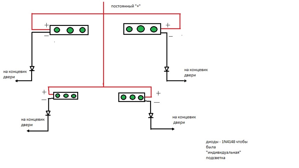 За разлика от предишните два метода, този включва работата по подчертаване на краката заедно с паркинг светлини. Такава настройка ще помогне по време на пътуване през нощта. Ако подсветката не се нуждае от постоянна работа, системата трябва да бъде оборудвана с допълнителен превключвател. Принципът на свързване е прост. Положителният изход на LED лентата се захранва от някоя от крушките за подсветка - например в жабката или на арматурното табло. Минусът се дава на тялото или, алтернативно, на крайния превключвател на вратата.