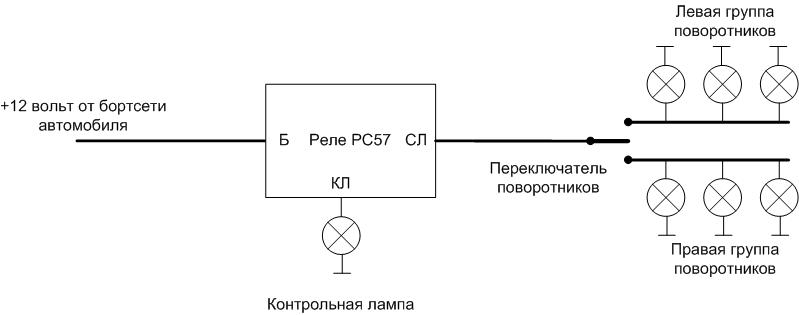 Местоположението на щифтовете на релето PC57 е показано на фигурата. Клема B се захранва с 12 волта от електрическата система на автомобила, сигналът се взема от клемата SL към лампите. Контролна лампа е свързана към клемата KL.