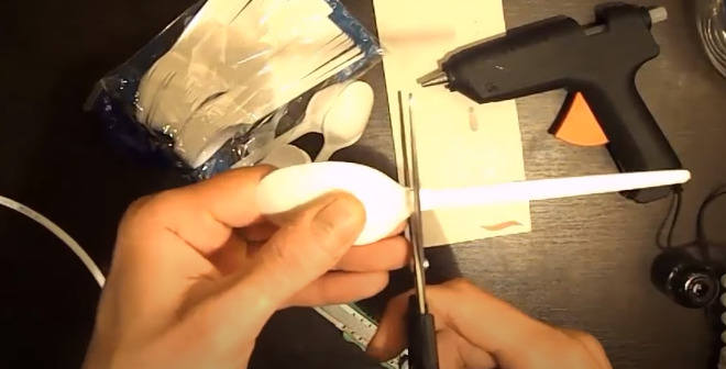 - Először elő kell készítenie az eszközöket és az anyagokat. Műanyag kanalakra, 4-6 literes kulacsra, írószerkésre, ragasztópisztolyra és ollóra lesz szükség.