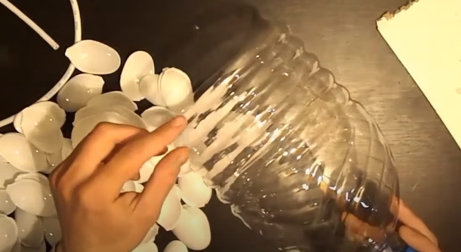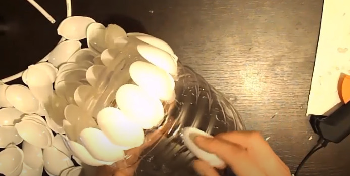 - Az üvegből el kell távolítani a címkéket, le kell vágni az alját. Ezután alulról felfelé kezdve ragasszuk fel a szirmokat a kanalakról.