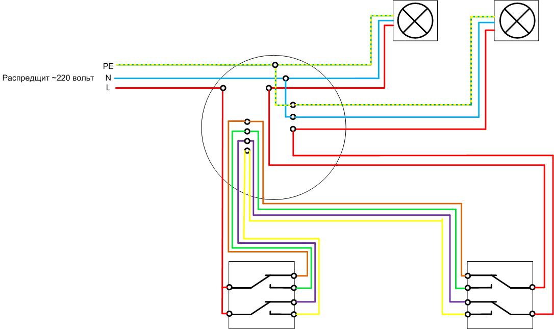 Изпълнението на този принцип е показано на диаграмата за случая на двугрупов превключвател. Ако се използват две проходни устройства, тогава инсталацията става по-сложна, особено ако има PE проводник.