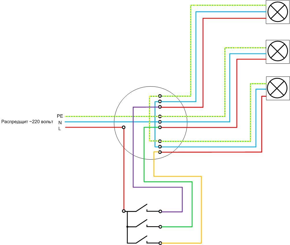 Като прост пример помислете как изглежда веригата свързване на ключ към електрическа крушка (налично е защитно заземяване). Трижилен кабел се вкарва от щита в кутията, а трижилен кабел също отива към лампата. Фазовият проводник е счупен, превключващо устройство е свързано към пролуката с помощта на двужилен кабел.