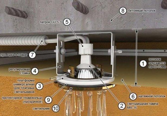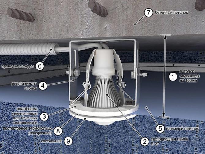 Таванните светлини се монтират на определено разстояние от монтажната повърхност. Самата лампа е окачена на захранващ декоративен кабел, който е фиксиран към тавана. Не е необходимо да укрепвате конструкцията с допълнителни детайли.