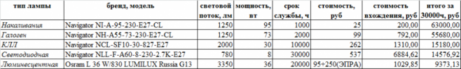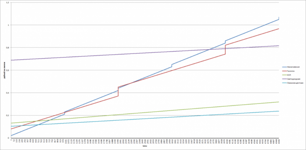 Въз основа на изчисленията най-скъпите от представените устройства са лампи с нажежаема жичка и халогенни лампи. Цената на светодиодите е сравнима с газоразрядните домакини, но флуоресцентните лампи, дори с мощност от 36 W срещу 8 W за LED лампи, са по-евтини. LED лампите започват да се изплащат само след 4000 часа и стават по-изгодни от енергоспестяващите след 25 000 часа работа, както се вижда на графиката.