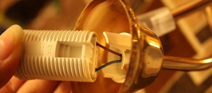 - Pakeisti kasetę lempoje lengva, darbas atliekamas atvirkštine tvarka. Pirma, laidai prijungiami prie naujo mazgo, tai daroma naudojant gnybtus arba suveržimo varžtus su plokštėmis, svarbiausia pašalinti laidų kontaktą ir jų trumpąjį jungimą. Tada kasetė įdedama į vietą ir pritvirtinama.Tada galima dėti šešėlius ir pakabinus ant lubų sietyną prijungti prie laidų.