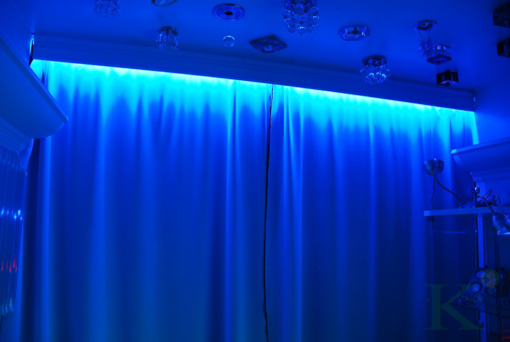 Dekorativ belysning med dioder kan være installere i to versjoner - foran gardinen eller bak den. Det første alternativet brukes oftest. På denne måten, lyset rettes ned på stoffet. For å oppnå denne effekten er boksen montert ved siden av kanten av gardinet og et diodebånd er plassert i den. Som et resultat vil lyset falle tangentielt.