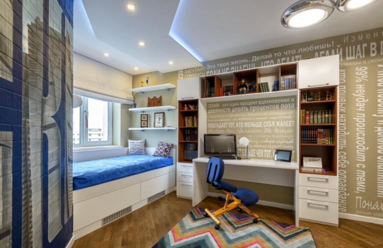 В детската стая не трябва да правите прекалено ярка подсветка, тя трябва да е ненатрапчива, за да не натоварва зрението на детето. Можете да подчертаете оригиналността на многостепенния дизайн на тавана или да подчертаете интересни мебели, като карта или картина на стената.