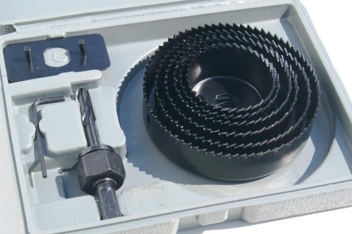- Преди да инсталирате вградени тела, трябва да изрежете дупки според диаметъра на тялото, посочено е на опаковката. За да направите това, използвайте корона или електрически прободен трион. Ако е монтирана опъваща лента, тогава предварително се залепва специален пръстен, така че материалът да не се разкъса при изрязване на дупка.