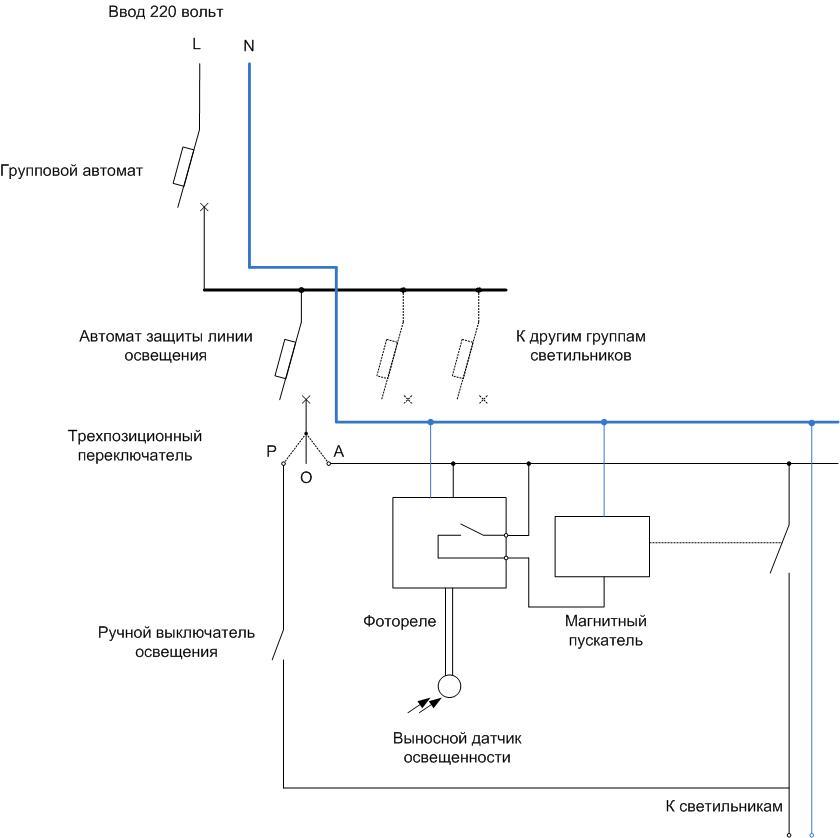 - Ръчен превключвател на светлината. Позволява ви да управлявате лампите в ръчен режим. Също така ще бъде полезно по време на ремонта в случай на повреда на веригата за автоматизация.