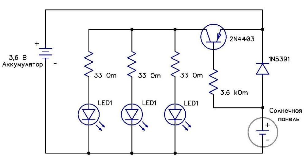 - След залез слънце, когато никаква светлина не удари фотоклетката, транзисторът се отваря и напрежението се подава към светодиодите. Тоест през цялото възможно време през деня оборудването се зарежда и с настъпването на здрача се включва.