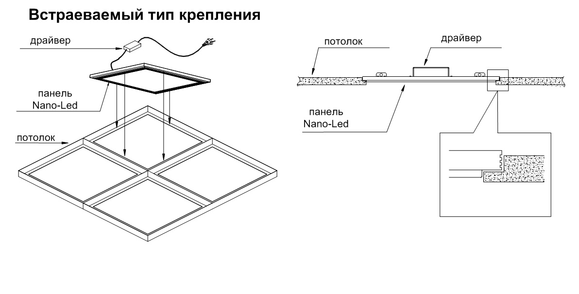 LED панелите са проектирани да се вписват в таванни конструкции. Основното изискване е съответствието с равнината на тавана на предната част на лампата. Ако таванът е стелажен или панел, трябва да се отдели място за лампата и да се постави с окачвания.