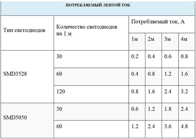 Тази опция е най-удобната и безопасна.Захранването обикновено се избира с резерв на мощност, така че добавянето на LED лента към захранването няма да претовари възела и няма да намали експлоатационния му живот. Първо трябва да изчислите какъв е текущият марж в ампери. Необходимо е да се сумират всички потребители (дънна платка, твърд диск, процесор, видеокарта и т.н.), данни за всеки елемент могат да бъдат намерени в мрежата. Обикновено има марж от най-малко 3-4 ампера, което е достатъчно, за да свържете няколко метра лента, удобно е да използвате таблицата по-долу, за да изберете конкретен размер.