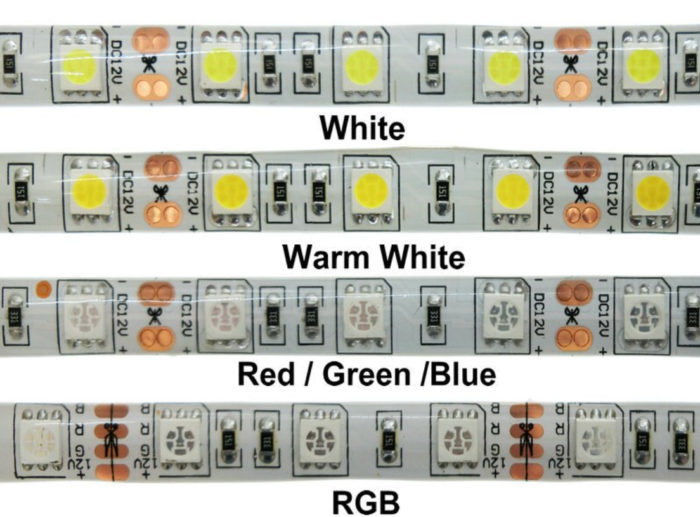 За RGB ленти се използват светодиоди, съдържаща в един корпус три кристала с различни цветове на излъчване. Те се управляват отделно, но анодите им са свързани. Обикновено тези елементи се използват и в безоловна версия.
