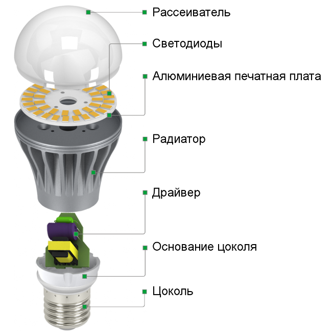 В повечето случаи LED лампите са изработени от алуминий, който е в състояние да осигури ефективно разсейване на топлината към радиатора. Вътре са монтирани различен брой светодиоди, което определя мощността. Контактните проводници на диодната лента имат субстрат от обратната страна за разсейване на топлината. Той е запоен към радиатора. Премахвайки един от диодите, той също ще трябва да бъде запоен.
