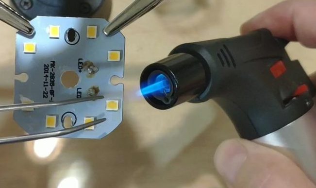 Когато всички изгорели диоди бъдат идентифицирани, можете да започнете запояване. Платката е фиксирана върху държача. След като горелката е внимателно донесена до задната част на дъската. След 3-5 секунди спояването трябва да се разхлаби, което ще направи възможно изключване на диода. Работният елемент трябва да бъде фиксиран преди основата да изстине.. За да направите това, върху контактната подложка трябва да се постави капка поток. Чипът е инсталиран отгоре, като се вземе предвид полярността.