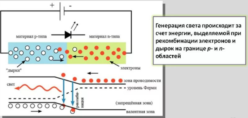 Чрез свързване на постоянно напрежение с определена величина и полярност към p-n прехода, те предизвикват електрически ток в кръстовището под формата на обратен поток от носители на електрически заряд - „дупки“ - положителни „частици“ и електрони - отрицателни. Когато тези потоци се срещнат в p-n кръстовище, те рекомбинират или се сливат. Свободен електрон с повишена енергия влиза в „дупката“ и тя изчезва.
