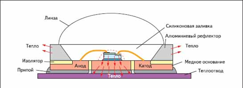 Топлоотвеждащият субстрат е изобразен в люляк. Сиви трапеции - секции от рефлектор-рефлектор с пръстеновидна конфигурация, изработени от алуминий.В синия център има LED чип-кристал със свързани златни или сребърни проводници, запоени към анодните и катодните изводи.
