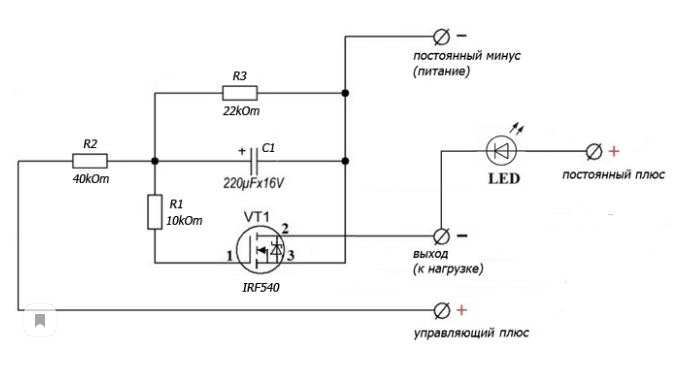 Първо, ток се прилага към втория резистор за зареждане на кондензатора. C1. На кондензатора индикаторите не се променят моментално, поради което транзисторът се отваря плавно VT1. Токът се подава към портата през първия резистор. Това провокира увеличаване на потенциала (положително) на полевия транзистор (изтичането му), поради което светодиодът се включва плавно.