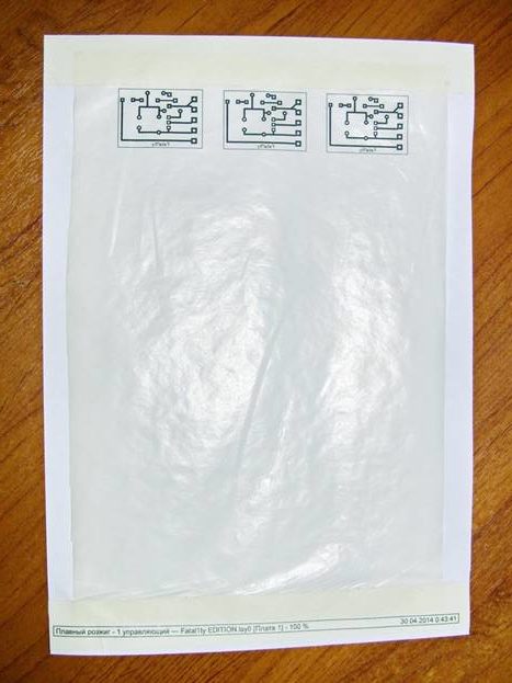 Схемата е залепена върху листа, като се загрява с ютия. За да се охлади дъската, тя трябва да се постави в студена вода за няколко минути и след това да се отстрани хартията. Ако не се отлепи веднага, трябва да се почиства постепенно.