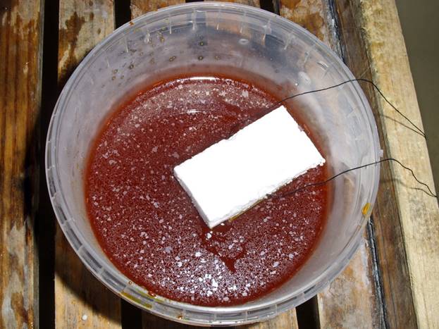 Използвайте двустранна лепяща лента, за да залепите дъската към пяната със същия размер и я поставете в разтвор на железен хлорид за 5-7 минути.За да не преекспонирате дъската, трябва периодично да я изваждате и да проверявате състоянието. За да ускорите процеса на ецване, можете да разклатите контейнера с течност. Когато излишната мед се гравира, дъската трябва да се измие с вода.