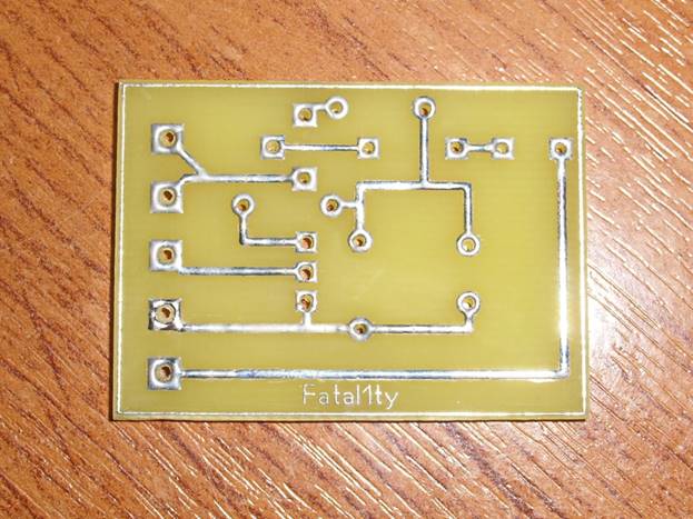 Следващата стъпка е да почистите пистите с шкурка и можете да започнете да пробивате дупки, за да монтирате елементите на дъската. След това трябва да платите таксата. За да направите това, той се смазва с флюс, след което се калайди с поялник. За да не се провокира прегряване или отваряне на веригата, поялникът трябва винаги да е в движение.