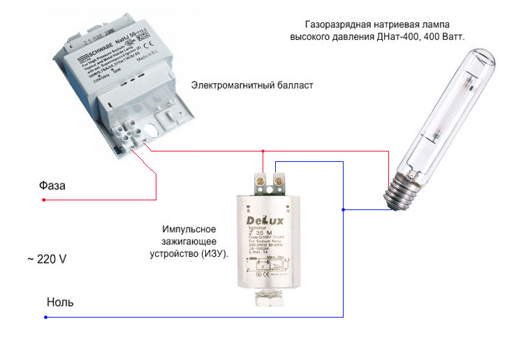 แผนภาพการเดินสายไฟ ง่าย ๆ : วงจรที่มีโช้คและหลอดไฟเชื่อมต่อกันเป็นอนุกรม ระบบเชื่อมต่อกับเครือข่าย 220 V ที่ความถี่ 50 Hz ตัวเหนี่ยวนำทำหน้าที่ของตัวแก้ไขและตัวปรับแรงดันไฟฟ้า