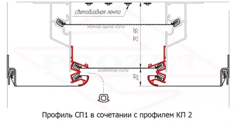 - SP1 - ประเภทสากลซึ่งใช้ทั้งในการสร้างเส้นแสงและสำหรับการเข้าร่วมผืนผ้าใบต่าง ๆ ในระดับเดียวกันหรือในการสร้างระบบหลายระดับ โดยปกติองค์ประกอบนี้จะแนบกับโปรไฟล์ KP2 ซึ่งอยู่บนเพดานช่องว่างระหว่างโปรไฟล์ทั้งสองถูกปกคลุมด้วยฟิล์มโปร่งแสงเพื่อกระจายแสง และข้อต่อตกแต่งด้วยเม็ดมีดรูปไข่ ในกรณีนี้ เส้นแสงจะฝังอยู่ในพื้นผิวเสมอ ไม่ใช่ว่าทุกคนจะชอบช่องเล็กๆโปรไฟล์เฟรม KP 2