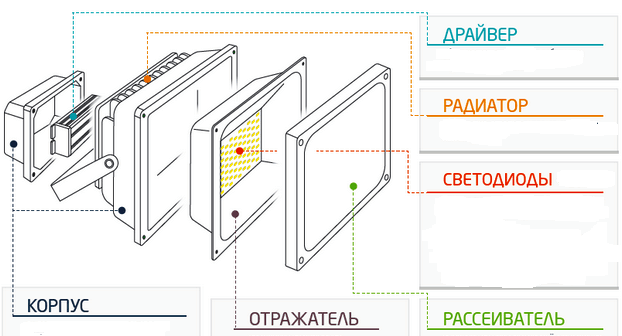 แสงสว่างสำหรับพื้นที่ขนาดใหญ่ รวมทั้งกลางแจ้ง มีการวางแผนตามหลักการอื่นๆ ซึ่งแตกต่างจากสภาพภายในอาคาร ประการแรก พื้นผิวสะท้อนแสงบนถนนมีน้อยกว่ามาก ดังนั้นจึงต้องการกำลังแสงมากขึ้น ประการที่สอง อุปกรณ์ได้รับผลกระทบจากปัจจัยด้านสิ่งแวดล้อมที่รุนแรง ตามลำดับ โครงสร้างทั้งหมดจำเป็นต้องได้รับการปกป้องจากความชื้น อุณหภูมิสุดขั้ว และประการที่สาม ไฟฉายมักจะตั้งอยู่บนเสา เสา หรือใต้หลังคาบ้าน ซึ่งการเปลี่ยนส่วนประกอบมีความเกี่ยวข้องกับความไม่สะดวกมากมาย ซึ่งทำให้ความต้องการทรัพยากรของพวกเขา ขึ้นอยู่กับจำนวนรวมของลักษณะทั้งหมด ทางเลือกสำหรับแต่ละสถานการณ์จะถูกกำหนด